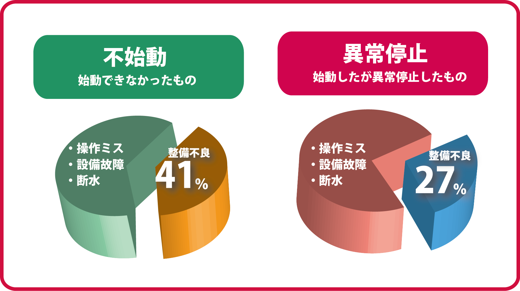2011年に発生した東日本大震災時には、燃料切れや津波の被害等を除いて、非常用発電機の機能を十分に発揮できなかった不具合の多くが、点検・整備不良によるものでした。
